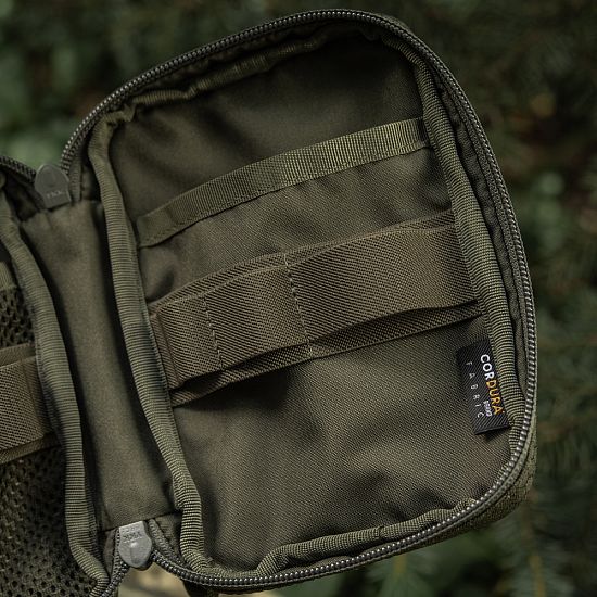 Внутрішній простір продуманий для максимальної практичності: дві місткі сітчасті кишені та еластичні фіксатори допомагають надійно закріпити вміст. Завдяки гачку органайзер легко кріпиться до MOLLE-інтерфейсу, а фронтальна велкро-панель дає можливість персоналізувати його патчами. Міцна Cordura та фурнітура YKK забезпечують довговічність і стійкість до зношування навіть під час активного використання.