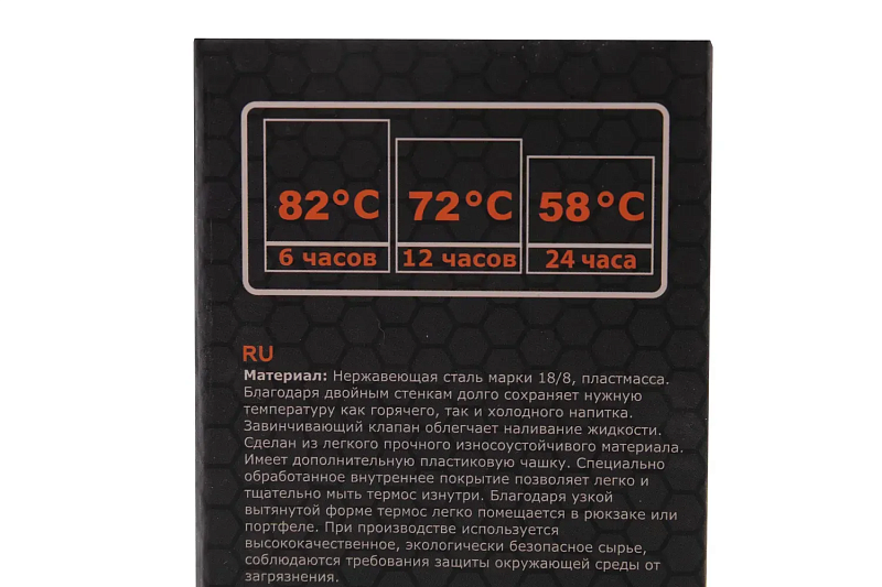 Термос укомплектовано глухим корком з каналами для наливання в напівзакритому стані. Така конструкція дозволяє наливати рідину, не відкручуючи корок повністю, що значно зменшує втрати тепла при використанні. Завдяки подвійній стінці довго зберігає температуру як горячих, так і холодних напоїв. Виготовлений з легкого й міцного матеріалу.
